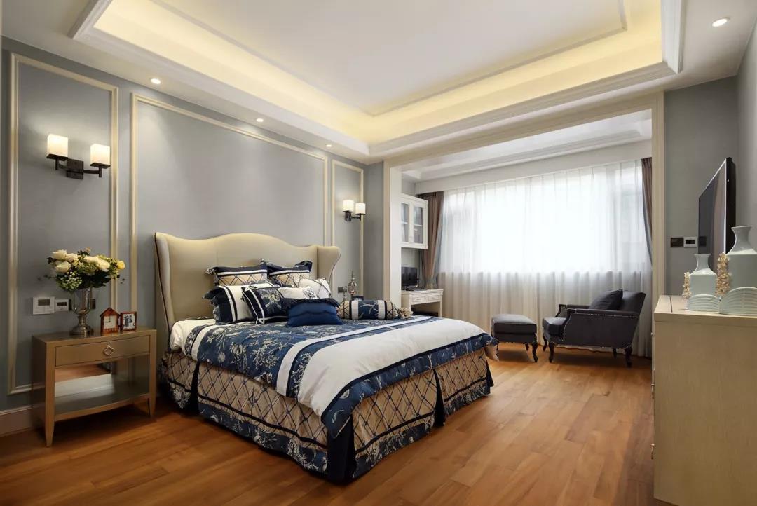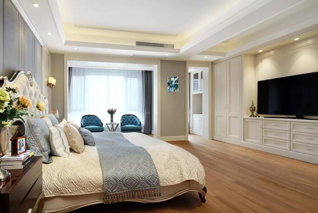 孔雀藍作為床頭背景的裝飾色彩,營造典雅冷靜的效果,配搭暖白色床背,點綴空間的悅動感。