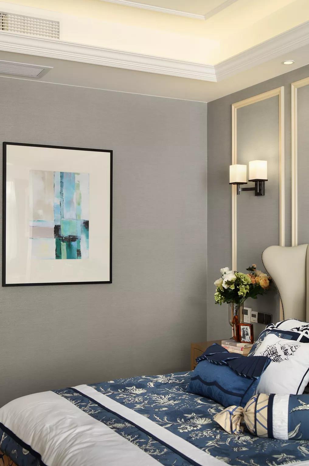 灰藍色,平和又沉靜的調和色彩采用時尚大氣的暖灰色床靠背,與整個房間的色系靈活結合。