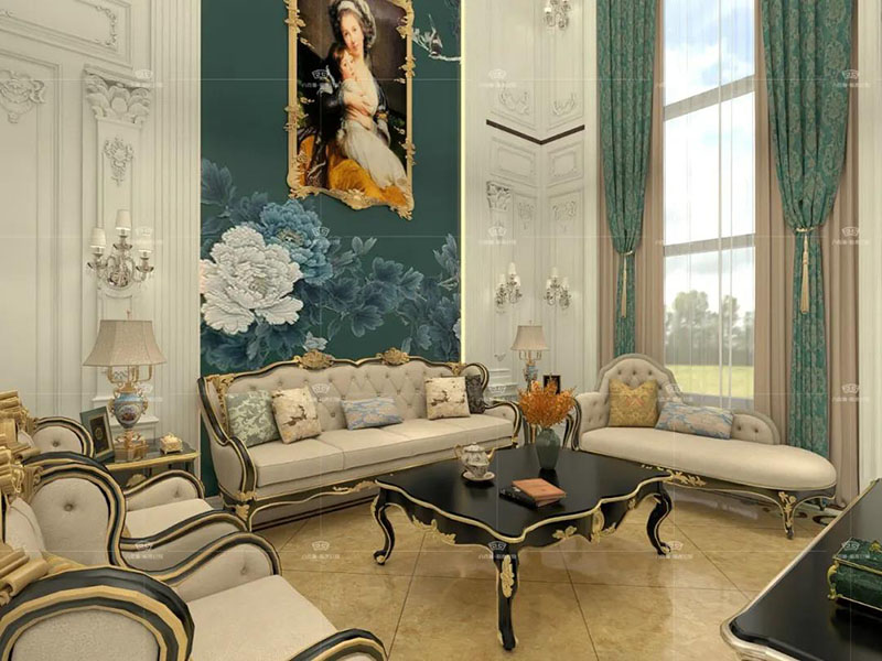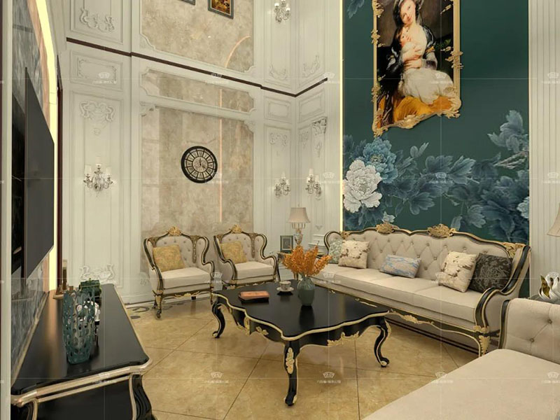客廳通過原木色的橫條分割成上下兩個部分,襯托出客廳的高度;再通過每個部分按“子母分割法”,再次將高度延伸。經典的雕花設計也是一大特色,使客廳不僅壯觀,而且具有貴族氣息。