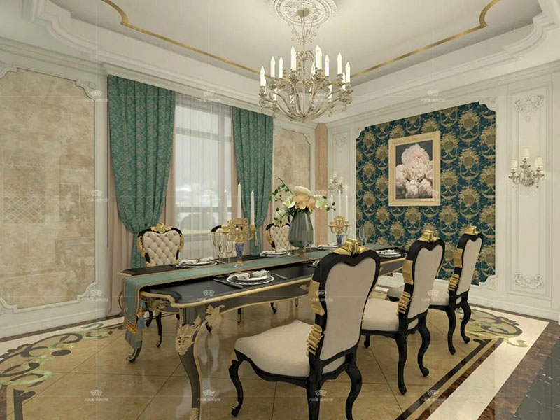 廚房分成了就餐區與制作區,就餐區使用了白色背景墻,搭配深色硬包,這樣吃飯的氛圍更加溫馨;廚房制作區因為空間足夠大, 同樣設計了多根羅馬柱,這樣使得廚房也有皇家范兒。