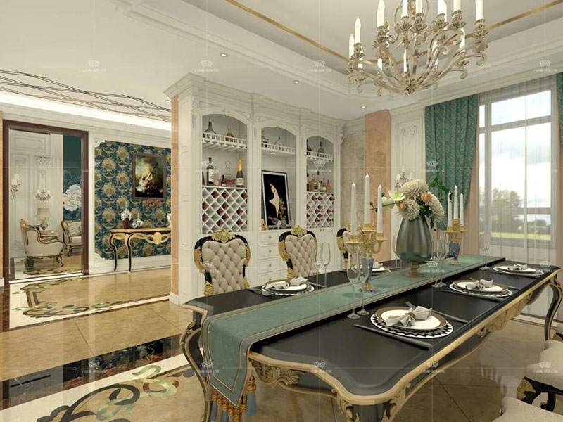 餐廳用鏤空的護墻板裝飾,讓整個空間留白,不會顯得擁擠。餐邊柜則做成了與酒柜二合一的空間設計,讓閑暇或待客時喝上兩杯紅酒易取且美觀。