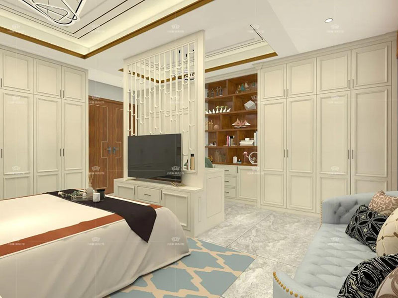 柜體采用了相對簡約的設計,上下分區明顯,收納性強。中間設計了一個電視柜,通過鏤空的歐式格柵連接了上下,給人安穩的感覺更強。