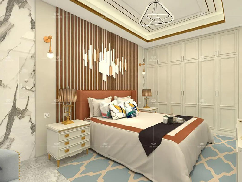 主臥背景使用了豎條的原木分隔排列,再搭配橫式金屬掛物點綴,整體看著和諧舒適,又頗具特色。